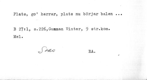 //// Plats, go1 herrar, plats nu börjar balen . //// X I //// B 27:1, s.226,Gumman Vinter, 9 str.kom. Mel. //// J RA. //// 1 ' **' jiÅ^iL^^^M ////