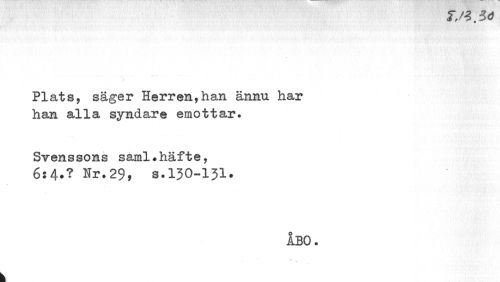 //// Plats, säger Herren,han ännu har han alla syndare emottar. //// Svens sons saml?häfte, //// 6:4»? Nr.29» s.130-131. //// ÅBO. //// k ////