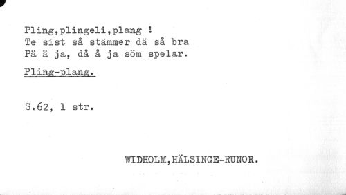 //// Pling,plingeli,plang l Te sist så stämmer dä så bra Pä ä ja, då å ja söm spelar. //// Pling-plang» S.62, 1 str. //// WIDHOLM,HÅLSINGE-RUNOR. //// / ////