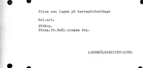 //// Plira man lagom på herregårdsdränga //// Mel.not* SVAKop. //// Fören?fr.Smål.minnen dep. //// LANDSMÅLSARKIVET:LUND. //// ^ 4 t # ////