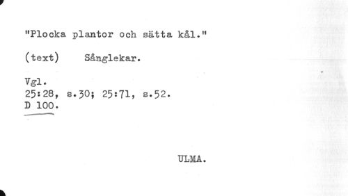 //// "Plocka plantor och sätta kål." (text) Sånglekar. //// . v • //// %1. //// 25:28, s.30; 25:71, s.52. //// D 100. //// A //// ULMA. //// k ////