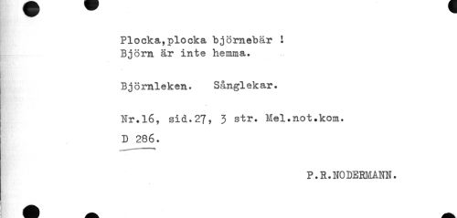 //// Plocka,plocka björnebär I Björn är inte hemma. //// Björnleken. Sånglekar. //// Nr.16, sid.27, 3 str. Mel.not.kom. D 286. //// P.R.NODERMANN. ////