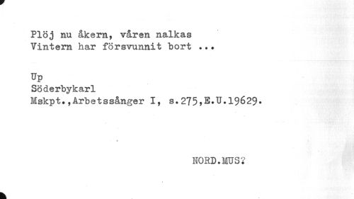 //// Plöj nu åkarn, våren nalkas Vintern har försvunnit bort ..? //// Up //// Söderbykarl //// Mskpt.,Arbetssånger I, s. 275,2. U.19629. //// • A //// NORD.MUS? //// k ////