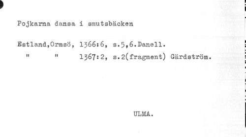 //// i ¦ //// Pojkarna dansa i smutsbäcken //// Estland,Ormsö, 136626, s.6.Danell. \ //// " //// " " 1367:2, s.2(fragment) Gärdström. f //// i //// ' i //// ' \ \' ' ' ' '" f //// ¦ //// ¦ //// ULMå. //// i I ////