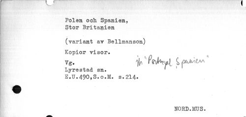 //// Polen och Spanien, Stor Britanien //// (variant av Bellmanson) Kopior visor» //// Yg. jfs iVJhpl i //// Lyrestad sn. v //// E.U.490,S.o.M. s.214* //// NORD.MUS. ////
