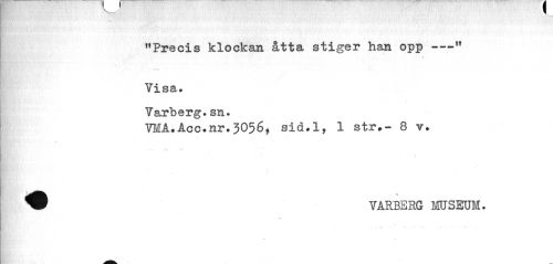 //// v... //// X //// "Precis klockan åtta stiger han opp —w Visa. //// Varberg.sn. //// VMA.Acc.nr.3056, sid.1, 1 str.- 8 v. //// v //// ™ VARBERG MUSEUM. ////