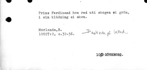 //// Prins Ferdinand hon red uti skogen Bi grön, ^^ i sin klädning si skon. //// / //// Mor landa, B. //// 10027:2, s. 32-36. —WWo //// 10JÖ> GÖTEBORG. ////