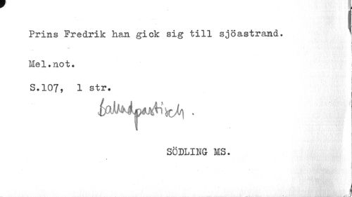 //// Prins Fredrik han gick sig till sjöastrand. //// ! //// Mel.not. //// v I //// S.107, 1 str. i //// SÖDLING MS. //// 1» j ////