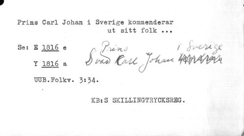 //// • , //// Prins Carl Johan i Sverige kommenderar //// ut sitt folk ?.• //// Se: E 1616 e /^u^kJ / 1 //// Y 1816 a i JCmIJ^U^ WMWk //// UUB.Polkv. 3*34- //// i //// KB:S SKILLINGTRYCKSREG. //// ! j //// I //// ! //// • i //// i ////