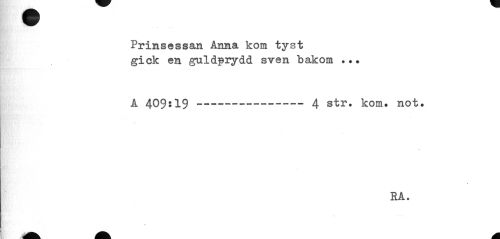 //// Prinsessan Anna kom tyst //// gick en guldprydd sven bakom ... //// A 409:19 --- 4 str. kom. not. //// f v »1 ¦ ' //// % //// RA. ////