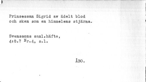 //// ; //// * //// Prinsessan Sigrid av ädelt blod //// och sken som en himmelens stjärna. 1 //// Svenssons saral.häfte, 4:8.? Kr.4, s.l. //// % //// ÅBO. j //// ... //// s //// I //// p ////