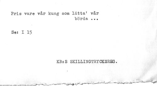 //// Pris vare vår kung som lätta1 vår //// börda .?• //// Se: I 15 //// KB:S SKILLINGTRYCKSREG-. ////