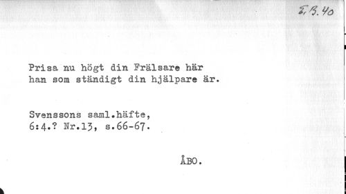 //// *r o. YO //// ¦ I //// Prisa nu högt din Frälsare här han som ständigt din hjälpare är. //// Svenssons saml.häfte, //// 6:4-? Hr.13, s.66-67. //// ÅBO. //// k ////