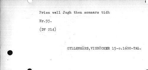//// Prisa well Jagh then sommars tidh //// * % //// Ur.93. //// (DY 214) //// 1 //// GYLLEMlRS, VISBÖCKEE 15-o.léOO-TAL. ////