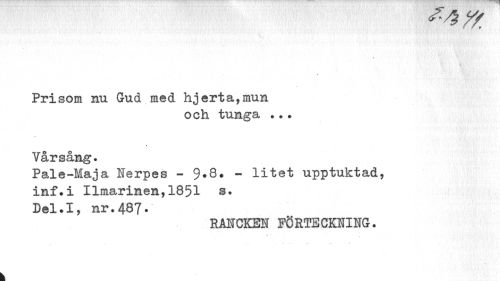 //// Prisom nu Gud med hjerta,mun //// och tunga ... //// Vårsång. //// Pale-Maja Nerpes - 9*8. - litet upptuktad, //// inf.i Ilmarinen,1851 s. //// Del.I, nr.487. //// RANCKEN FÖRTECKNING. //// T . • //// 1 ////