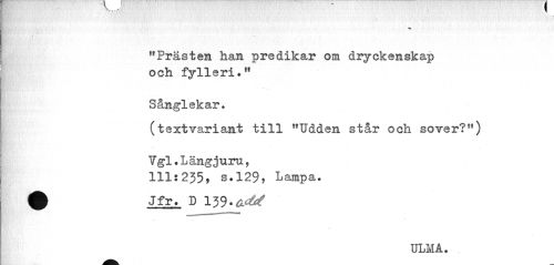 //// 1 //// "Prästen han predikar om dryckenskap och fylleri." //// Sånglekar. //// (textvariant till "Udden står och sover?") Vgl.Längjura, //// 111:235? s.129, Lampa. //// 9 Jfr. D 139.&C&? //// ULM A. . ////