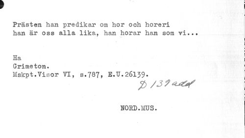 //// I //// t • //// Prästen han predikar om hor och horeri //// han är oss alla lika, han horar han som vi... //// - //// Ha j //// Grimeton. [ //// Mskpt.Visor VI, s.787, E.U.26139. [ //// jfr //// NORD.MUS. ////