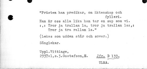 //// "Prästen han predikar, om äktenskap och £ fylleri. //// Han är oss alla lika han tar en sup som vi. :,: Tror ja trallan la, tror ja trallan la:,: Tror ja tra rallan la." //// (Lekes som udden står och sover.) //// Sånglekar. //// Uppl.Vittinge, //// 2937s 1 ? b. 3.Gustafson,E. Jfr. D 13§>. //// ULMA. ////