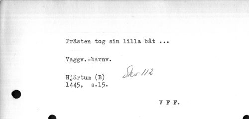 //// Prästen tog sin lilla båt //// i i"? < J //// Vaggv.-barnv. Hjärtum //// (B) SU"* //// 1445, s.15. //// V P F. ////