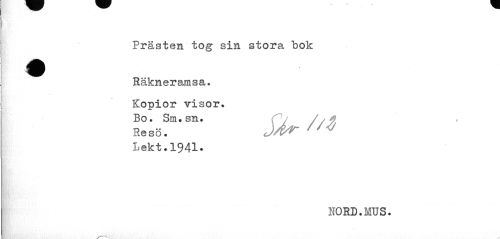 //// Prästen tog sin stora bok //// Q //// Räkneramsa. Kopior visor. //// jfr- //// Lekt.1941• //// NORD.MUS. ////