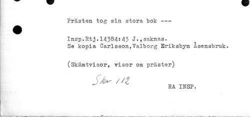 //// Prästen tog sin stora bok --- //// Insp.Rtj.14384*43 J»,saknas. //// Se kopia Carlsson,Talborg Eriksbyn Åsensbruk. (Skämtvisor, visor om präster) //// S^ / //// RA INSP. ////