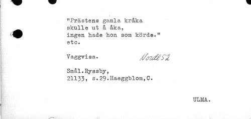 //// j //// "Prästans gamla, kråka //// • skulle ut å åka, //// ingen hade hon som körde." etc. //// Vaggvisa. /(fa //// Smål. Ryssby, //// 21133, s.29.Haeggblom,C. //// ULMA.. ////