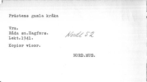//// /f //// i //// Prästens gamla kråka I //// r //// Vrm# //// Råda sn.Hagfors. /i^/^f //// Lekt.1941• ' ! //// Kopior visor. //// - //// NORD.MUS. //// ¦ //// I //// i //// i i ////