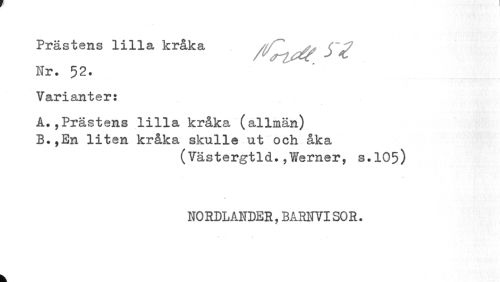 //// Prästens lilla kråka ,, S ^ //// Nr. 52. //// Varianter: //// A.,Prästens lilla kråka (allmän) //// B.,En liten kråka skulle ut och åka //// (Västergtld.,Werner, s.105) //// 4 //// NORDLANDER,BARNVISOR. //// u -+ * //// k ////