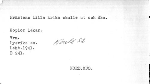 //// Prästens lilla krika skulle ut och åka. s //// Kopior lekar. //// Lysviks sn. /f/^U^ J ^ //// Lekt.1941. //// D 241. //// » //// . L //// I //// NORD-MUS. I //// ! ¦ //// i ////