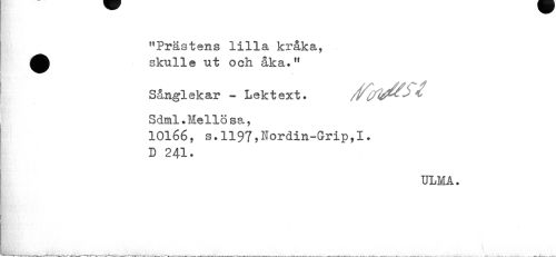 //// "Prästens lilla kråka, ^^ skulle ut och åka." //// Sånglekar - Lektext. < //// Sdml.Mellösa, //// 10166, s.1197,Nordin-Grip,I. //// D 241. //// ULMÅ. ////