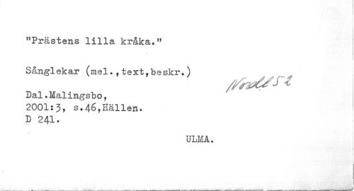 //// i I //// i //// C | //// "Prästens lilla kråka»" //// i //// i //// i //// l i //// i# //// Sånglekar (mel.,text,beskr.) Dal.Malingsbo, //// 2001:3, s.46,Hällen. ! //// D 241- //// v //// ULMA. //// « ////