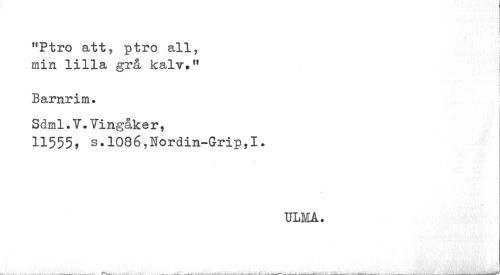 //// r //// ! //// i i i //// "Ptro att, ptro all, i //// min lilla grå kalv." //// f [ > //// Barnrim. //// Sdml.V.Tingåke r, //// 11555? s.1086,Nordin-Grip,I. //// s //// i //// » //// ULMA. ////