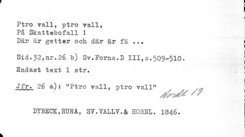 //// • ...I //// Ptro vall, ptro vall, På Skattebofall 1 //// Där är getter och där är fä ... ! //// i //// i //// Sid.32,nr.26 b) Sv.Forns.D III,s.509-510.¦ | //// p //// t //// Endast text 1 str* . . i //// I //// i //// k //// Jfr. 26 a): "Ptro vall, ptro vall" //// DYBECK,RUNA, SV.VALLV.& H0RNL. 1846. ////