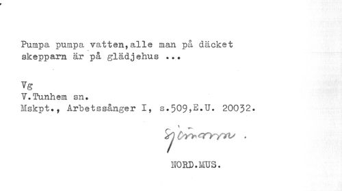 //// Pumpa pumpa vatten,alle man på däcket skepparn är på glädjehus ... //// Yg //// V.Tunhem sn. //// Mskpt., Arbetssånger I, s.509,E.U. 20032. //// Y) <TYY$V . //// NO BD. MUS. ////
