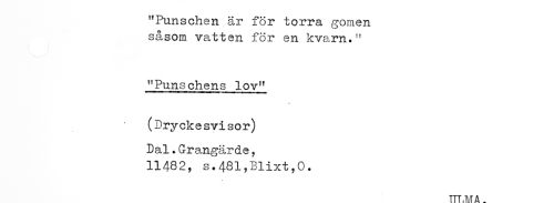 //// "Punschen är för torra gomen såsom vatten för en kvarn." //// "Punschens lov" //// (Dryckesvisor) //// Dal.Grangärde, 11482, s.481,Blixt,0. //// TTLMA. ////