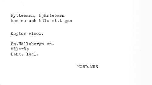 //// Py 11 e b arn, hj ärt ebarn kom nu och häls mitt gan //// Kopior visor. Sm.Hälleberga sn. //// Målerås //// Lekt. 1941. //// HORD.MUS ////