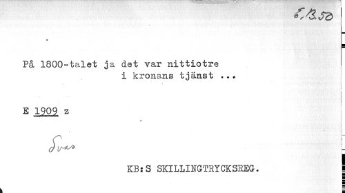 //// ¥ //// På 1800-talet ja det var nittiotre //// i kronans tjänst ..? //// • ? //// T I //// J //// v, ¦ • .o ¦ ' i i i //// E 1909 z //// i //// SlH^ l //// KB:S SKILLINGTRYCKSREG. | //// ... | ////
