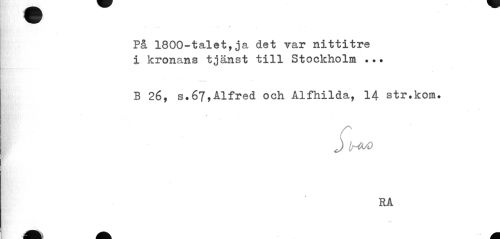 //// ... ... //// På 1800-talet,ja det var nittitre i kronans tjänst till Stockholm //// B 26, s.67,Alfred och Alfhilda, 14 str.kom. //// i H<sO //// RA //// /•i ////