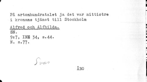 //// 1 //// 1 //// På artonhundratalet ja det var nittiotre i kronans tjänst till Stockholm j //// Alfred och Alfhilda. ! //// SN. i //// 9:7, I1IE 34, s.44. ! //// N. s.77. l //// i //// i //// JV^o //// ÅBO //// i //// k i ////