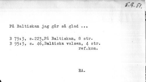 //// På Baltiskan jag går så glad . //// B 79:3, s.223,På Baltiskan, 8 str. B 955 3 > s* 46,Baltiska valsen, 4 str. //// ref.kom. //// RA. I //// ¦ //// 8 ¦ //// i //// 1 ////