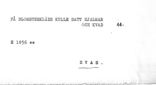 //// PÅ BLOMSTERKLÅDD KULLE SATT HJALMAR //// OCH KVAD 44- //// % //// E 1856 ee //// S V A S . ////