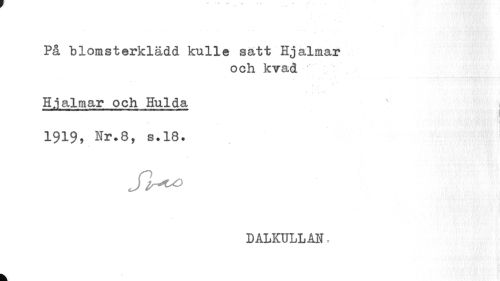 //// På blomsterklädd kulle satt Hjalmar //// och kvad ; //// Hjalmar och Hulda 1919, Nr.8, s.18. //// DALKULLAN. //// k ////