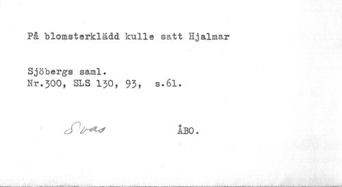 //// På blomsterklädd kulle satt Hjalmar //// v. * //// Sjöbergs saml. //// Kr.300, SLS 130, 93, s.6l. //// J ÅBO. ////