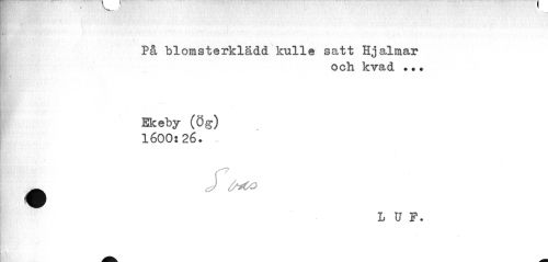 //// IPå blomsterklädd kulle satt Hjalmar //// och kvad ... //// Ekeby (Ög) 1600:26. //// ~ J fcCo //// L U F. ////