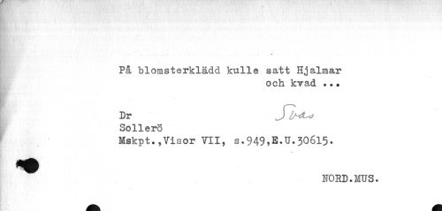 //// • ' --- ---' //// På "blomsterklädd kulle satt Hjalmar //// och kvad ..» //// Dr fl^ //// Sollero //// Mskpt.,Visor VII, s.949^.n.306l5. //// NORD.MUS. ////