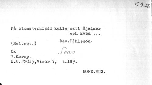 //// I //// i //// På blomsterklädd kulle satt Hjalmar //// och kvad ... //// /1?r n , \ Dav.Påhlsson. //// VMel.not.) //// Sk ji^UO //// V.Karup. //// E.U.22015,Visor V, S.I89. //// NOED.MUS. ////