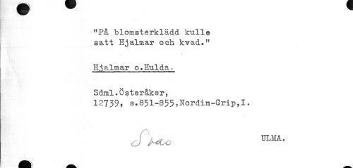 //// Hl ^ //// "På blomsterklädd kulle //// satt Hjalmar och kvad." //// » //// Hjalmar o.Hulda. //// Sdml.Österåker, //// 12739, s.851-855,Nordin-Grip,I. //// J Mo mjKk' ////