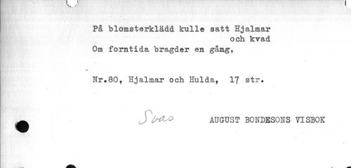 //// " 'v //// ¦ //// På blomsterklädd kulle satt Hjalmar //// och kvad Om forntida bragder en gång, //// . //// Nr,80, Hjalmar och Hulda, 17 str. ^ AUGUST BONDESONS VISBOK ////