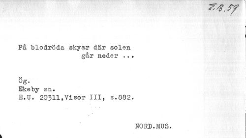 //// I //// 1 //// På blodröda skyar där solen //// går neder ?. # //// i //// Ög. //// Ekeby sn. //// E.U. 20311,Visor III, s.882. //// > r «• > //// NORD.MUS. ////