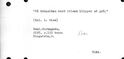 //// ,!På Bohusläns kust ibland klippor så grå." (Mel. t. visa) Sdml.Strängnäs, //// 2197, s.133 kaps. ffaiA //// Ringström,A. //// ULMA. ////